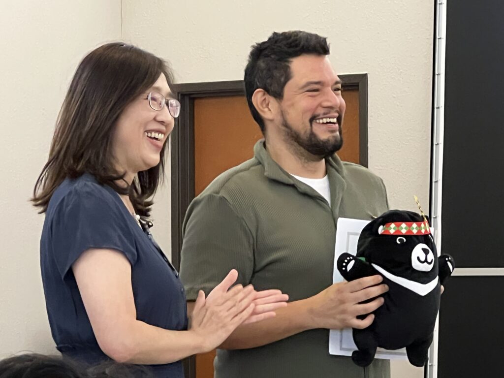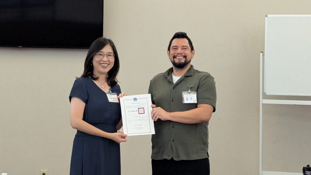 Direct Yvonne Wang of the Cultural Office in Houston presented the Certificate of Merit for winning 5th Place of TCML Group in 2025 OCAC Global Mandarin Speaking Competition to 康阿龍 Aaron Cano